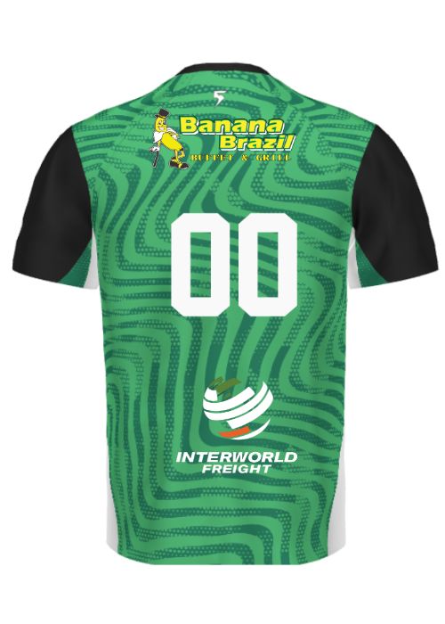 Fast-drying Impact United Green Jersey with sponsors and customization of first name/last name.